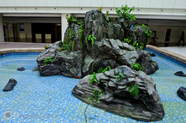 从门诊大厅往内直走进入建筑物最里部留有一个巨大的天井,地面散布多个巨大的不规则的浅水池,灵顿设计师考虑到自然景观对患者康复所起到的积极的效果,故将山水之景搬入室内,采用现在比较主流的造景方式,用树脂雕刻,手工打磨,最后表面上色,山体内部装有模拟水泉,在外部营造出山间潺潺溪流不断涌动的动态效果,具有效果逼真,坚实耐用等优点。山水相映,生机勃勃,符合“背山临水,藏峰聚气”意境,营造了“依山傍水”的环境舒适感,给医院环境增添了几分意境,有利于病患心情舒畅,病去康来。此景又取“山水相依”之意,寓意医患之间相依相存,不可或缺的紧密关系,为促进医患和谐发展发挥积极的推动用。