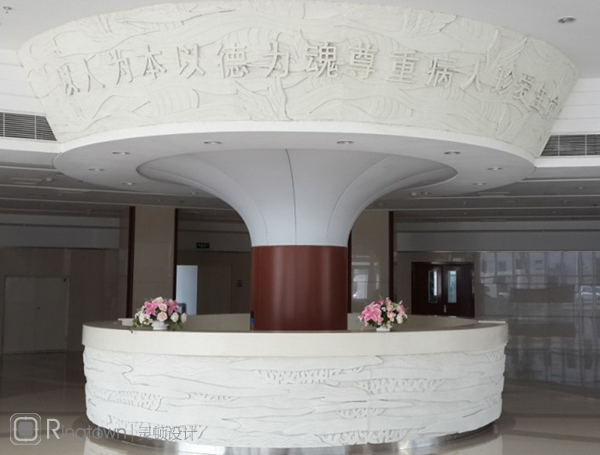 经过门诊大厅,穿过设备楼,最后进入VIP病房楼,楼梯中心位置是一个环状的服务台,在这里稀松平常的服务台也成了浮雕展示的平台:服务台体外表面是红海滩的自然风光,服务台顶端与顶棚连接的圆台外表面雕有“以人为本,以德为魂,尊重病人,珍爱生命”的字样,传达了医院的服务理念。考虑到室内环境特点,此处浮雕为仿砂岩的材质,在色彩接近墙体的白色,具有轻快的感觉,体现了艺术装点环境的实际价值。