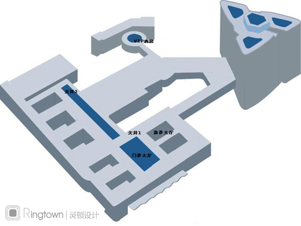 医院大楼建筑主题为“风生水起”,在楼梯外形上结合了风车的造型,内部结构别致,大面积的墙面和公共空间相对较多,形式也不尽相同。灵顿根据空间布局特点及所处位置患者的不同心理配合多种雕塑形式进行医学人文氛围的有效营造和恰到好处的艺术烘托。
