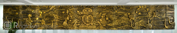 为平衡一定空间内视觉效果,建筑物二楼一处宽敞明亮的大厅一侧墙面以浅浮雕形式加以装饰,适当增加了空间的踏实性,却避免了压迫感。画面以《医患一家亲》为主题,展现医院治“厚德、尚和”的文化理念。画面描绘出医护人员为患者提供治疗工作以外的康复、关怀服务的场景,展现医护人员和患者之间“合群”的精神特质。整个画面至于阳光普照的大背景之下,寓意中心医院医护人员用高尚的医德、细致的服务温暖患者的内心,使患者在身体上、心灵上都得到康复。