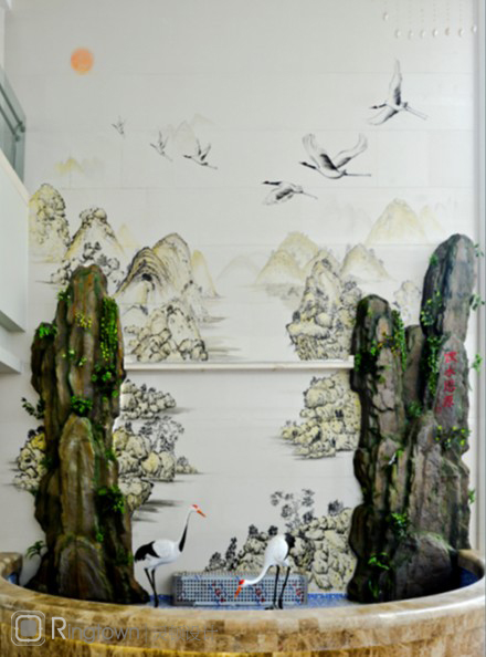 门诊大厅与急诊大厅连接天井处是一组名为《饮水思源》的景观造型,融合了圆雕、浮雕,墙绘等多种艺术形式,营造了远近、虚实的层次感,自然地将远山飞鹤与近体石山、仙鹤雕塑融为一体,形成一幅内容丰富,画面完整的艺术作品。水流自山间潺潺流入池中,仙鹤悠闲觅食饮水,营造出一派清静悠远、自然和谐的完美景象。寓意了美好的生活得益于自然的恩赐,医院的发展得益于上级诸位领导和盘锦市人民的全力支持,而医院则会充分利用“天时地利人和”的绝佳条件,回馈给盘锦大众百姓一个舒适、安心、悠闲的医疗环境,为保障百姓健康而不断努力。