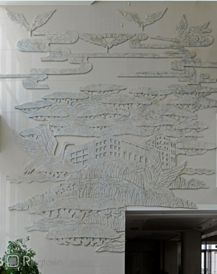 盘锦特色地域风情用不同的浮雕形式在医院各个角落展现,既时刻提醒观众身处何地,又能给观众留下深刻而美好的印象。天井中,急诊大厅一侧的墙面上一副名为《盘锦风情——吉祥》浮雕映入眼帘,画面展现了盘锦更为高远的自然风情,并将中心医院融入其中,它脚踏大地——这里有收获的稻田、美丽的红海滩;它头顶青天——那里祥云萦绕,仙鹤翱翔,给人以巍峨、正气的感觉,映射了医院的精神气质。