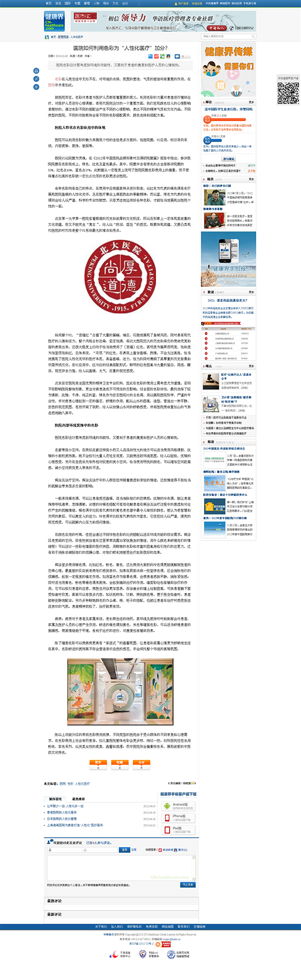 色彩在人类生活中无处不在,对环境的点缀、氛围的营造、气质的塑造均有重要的作用,在医院中亦是如此。