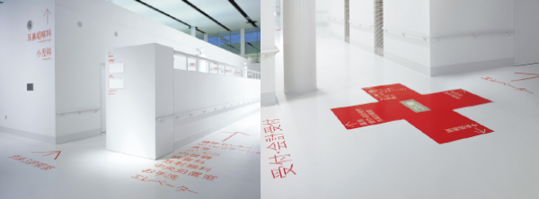 梅田妇产医院整个建筑内部以纯白为主导色,地面、墙壁、天花板是无一例外的纯白。原研哉创新性地在地面和墙壁上,采用丝网印刷,印刷红色的指向箭头和科室与楼层信息进行指向,这打破了常规对标识的运用,使建筑空间结构成为导示载体。目的科室的信息标识,是状似靠垫的白色布制方形物体,这种处理让原本有着僵硬棱角的指示牌开始变得有生气,有人情味。吊牌也采用印制有红字的纯白悬挂口袋。无论是布靠垫或者布口袋都颠覆了传统标识的材质、形状和颜色等常态选择。