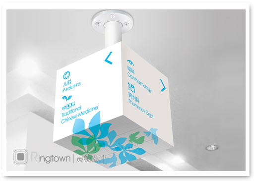 安徽马鞍山中心医院设计的整体品牌形象入选了《2009年国际设计年鉴》。我们在这个造型上采取了一种非常规的设计,虽然是异型,但是可操作性是有保证的。在很多大型购物广场的中庭,经常可以看见起装饰作用的悬挂物。一般的吊牌只能两面指向性,用吊牌或者贴牌的话,都需要用好几块标识才能把四边的区域都展示出来,我们在这里采用了悬挂的方形标识,自然展示四方区域的信息,且四面宽裕的空间,指向之余还能容纳更多的细化信息。