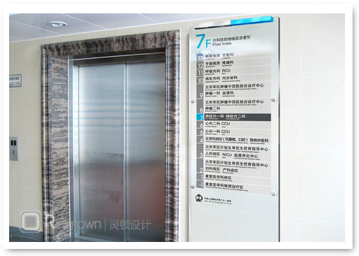一般而言,标识多采用不锈钢板、镀锌板、型材等金属材质比较多,而我们在做中国人民解放军第251医院方案设计时,却几乎完全用亚克力板来做,但对固定亚克力板的金属固定架进行特别处理,有的用原色不锈钢,有的用不锈钢结合楼层色彩规划进行烤漆处理。
