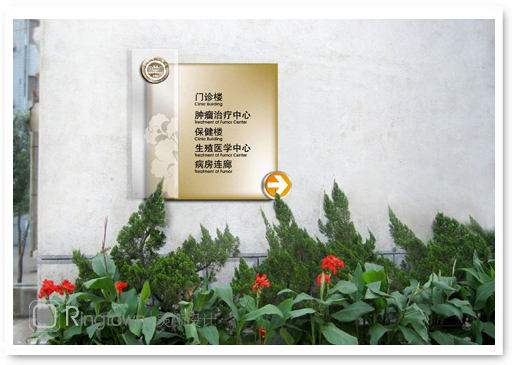 在山东省立医院标识系统设计方案中,我们考虑到医院的院徽为赭石色,所以户外标识的颜色选用了泛金色,这样使标识的色彩与院徽的色彩具有连续性。泛金色的户外标识与透明亚克力相配合,充分彰显了医院与时俱进的现代与大气。
