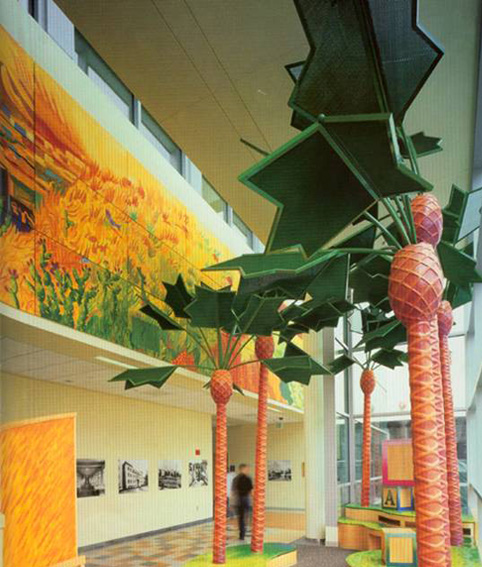 美国洛杉矶儿童医院别出心裁地为小患者们创造了生动的医疗环境,巧妙地把自然风景通过艺术设计带入到医院装饰中来。他们充分考虑并融合了小朋友们感兴趣的因素,如透过整面的窗户和透亮的天棚,透视到明媚的阳光和花园;儿童阅读区中色彩丰富的风景壁画、造型简约的树型装饰,院内院外的生动景观,呼应形成了整体空间上的视觉互动,无一不体现着回归自然、尊重生命的文化主题。尤其精彩的点睛之笔是将生机勃勃的大树创新地搬进了室内,更体现出为小患者健康着想的医院文化理念。