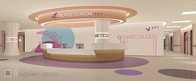 儿科环境图形设计立足艺术、童趣、国际化,打造充满童趣的医疗之城;妇科环境图形系统延续VI辅助图形,突出优雅、生机、国际化,别出心裁地采用了以羽毛与植物相结合,体现现代女性气质。