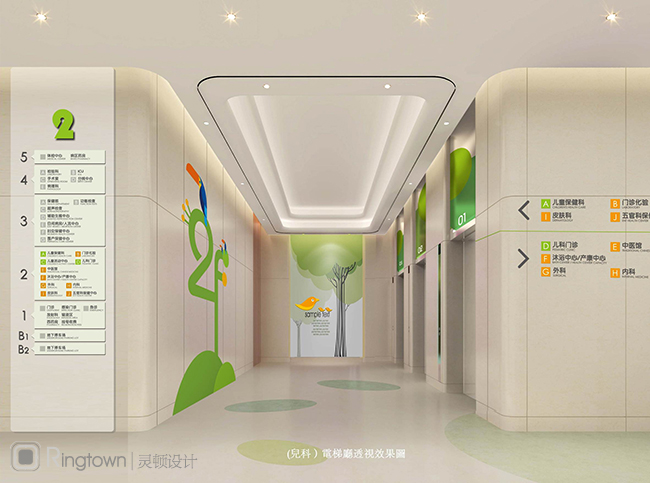 在环境导视与环境图形的设计中,灵顿兼顾了传统医院通透的视觉感受和妇女儿童对色彩与空间构成感知的不同点,整体设计既大气又活泼。趣味性图形符号、标识的使用,更提高了受众人群的认知度。