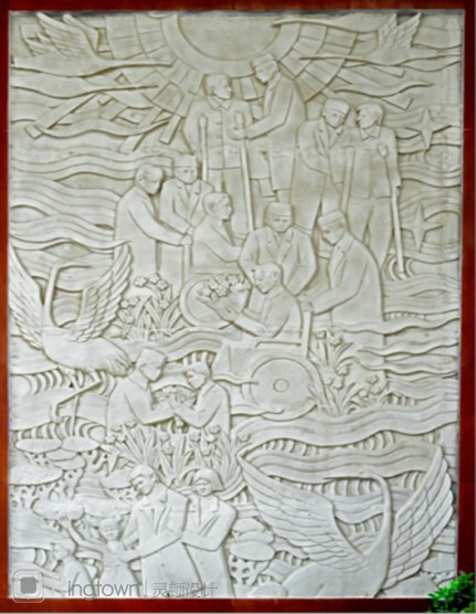 为平衡一定空间内视觉效果,建筑物二楼一处宽敞明亮的大厅一侧墙面以浅浮雕形式加以装饰,适当增加了空间的踏实性,却避免了压迫感。画面以《医患一家亲》为主题,展现医院治“厚德、尚和”的文化理念。画面描绘出医护人员为患者提供治疗工作以外的康复、关怀服务的场景,展现医护人员和患者之间“合群”的精神特质。整个画面至于阳光普照的大背景之下,寓意中心医院医护人员用高尚的医德、细致的服务温暖患者的内心,使患者在身体上、心灵上都得到康复。