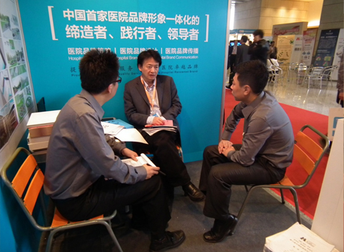 参会嘉宾在展台上了解“医院品牌形象一体化”相关内容