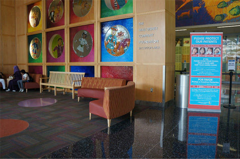 美国洛杉矶儿童医院别出心裁地为小患者们创造了生动的医疗环境,巧妙地把自然风景通过艺术设计带入到医院装饰中来。他们充分考虑并融合了小朋友们感兴趣的因素,如透过整面的窗户和透亮的天棚,透视到明媚的阳光和花园;儿童阅读区中色彩丰富的风景壁画、造型简约的树型装饰,院内院外的生动景观,呼应形成了整体空间上的视觉互动,无一不体现着回归自然、尊重生命的文化主题。尤其精彩的点睛之笔是将生机勃勃的大树创新地搬进了室内,更体现出为小患者健康着想的医院文化理念。