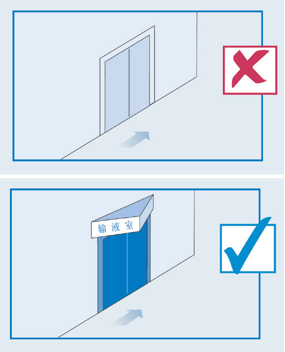 每个人在行动之前都要经过接受信息,进行认知、判断,继而行动。患者在医院通道中行走时,需要不断地确认方向,一旦丧失方向感、空间感、距离感,感到这条路不知通向何处时,就会产生“迷失感”。